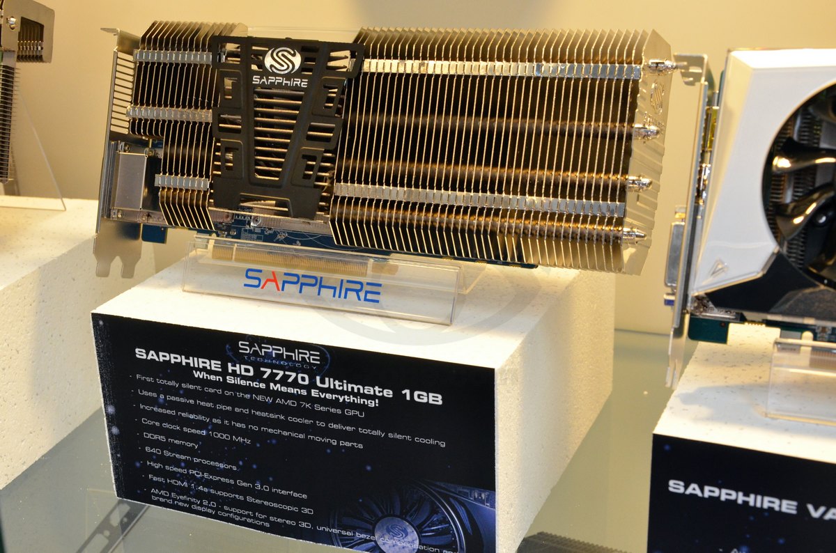Sapphire ha mostrato la HD 7770 Ultimate 1GB, dotata di un dissipatore imponente che sovrasta di gran lunga il PCB della scheda. Dotata di un certo numero di heatpipe e di una generosa struttura lamellare in alluminio, la GPU HD 7770 non è stata castrata rispetto alle specifiche reference, operando sempre a 1000 MHz.