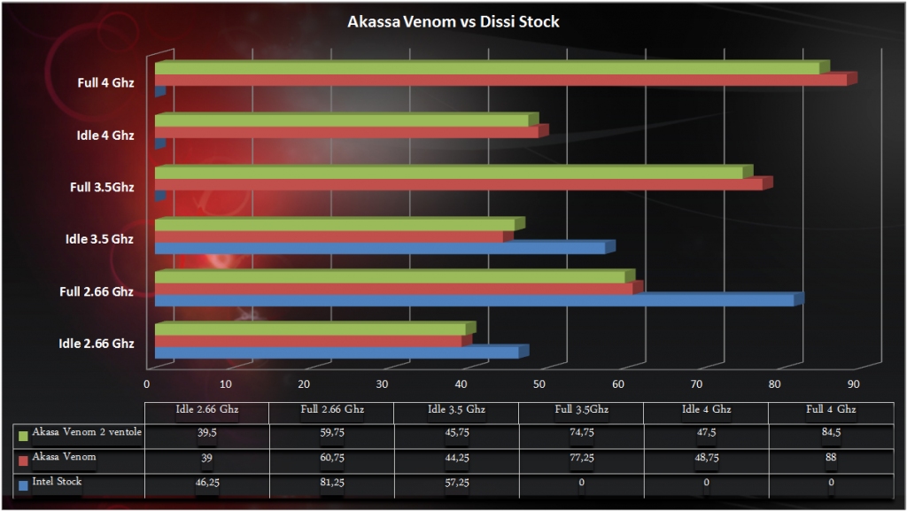 Il Venom come si può vedere dal grafico sovrastante è un buon dissipatore che consente buoni margini di Overclock. Siamo riusciti senza problemi a portare la cpu a 3.5 Ghz, mantenendo in full-load temperature accettabili. A 4 Ghz si raggiunge una temperatura di circa 90°C, eccessiva secondo il nostro parere, ci aspettavamo sinceramente temperature migliori.