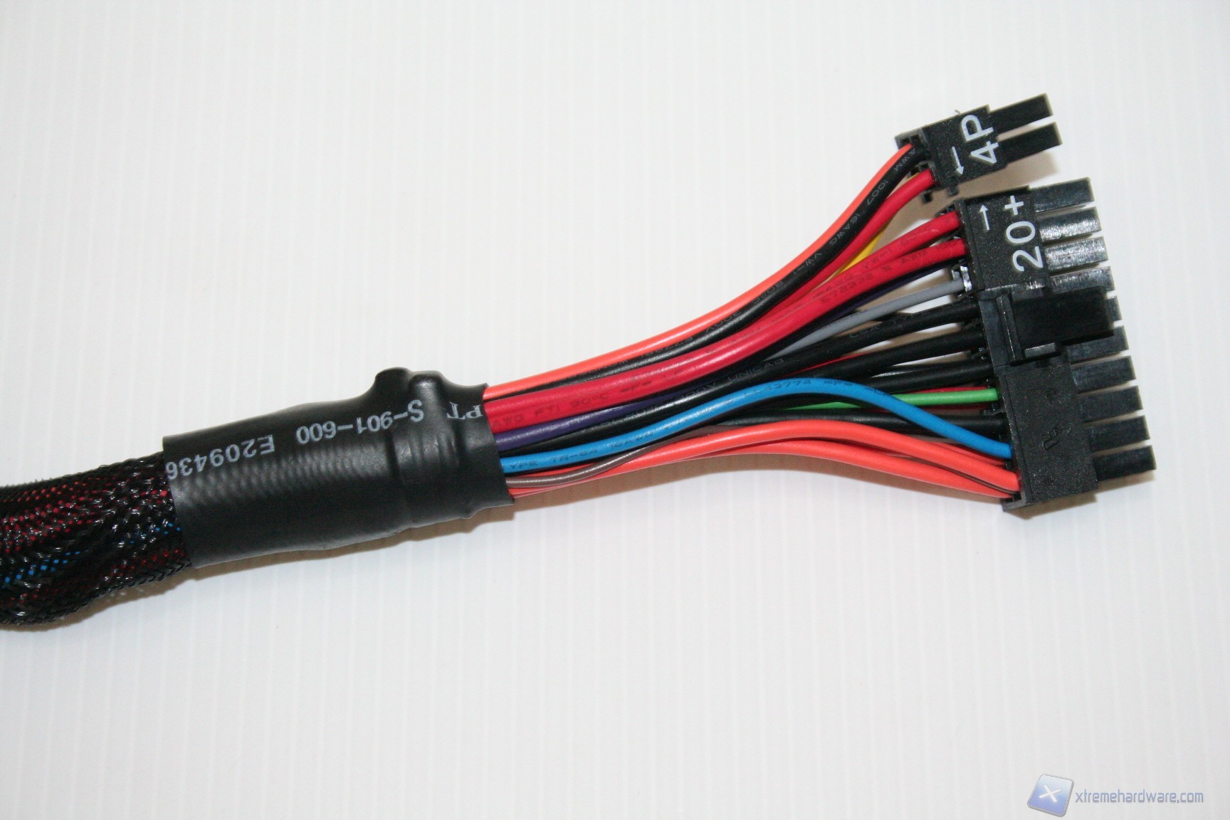 Vi mostriamo una fotografia della lunghezza dei cavi. La lunghezza minima è 580mm, più 15cm per ogni altro connettore secondario; questo permetterà di raggiungere facilmente tutte le periferiche del nostro sistema, anche nel caso di cabinet grandi. Data la presenza di due connettori da 6+2 Pin, molex e connettori di alimentazione SATA, sarà possibile alimentare un sistema davvero potente ed equilibrato, anche per via dell’utilizzo fanless entro i 600W di utilizzo. E’ ovviamente presente il supporto a soluzioni Dual e persino Quad GPU, in quanto sono presenti fino a 6 cavi da 6+2 Pin di alimentazione. Con questo alimentatore potrete installare, senza il minimo problema uno SLI di GTX 690 / oppure un CFX di AMD HD 7990, assieme ad una potente CPU overcloccata. L’alimentatore è parzialmente modulare per via del problema precedentemente espresso ovvero che la tipologia dei connettori posteriori ha impedito il conferimento di una completa modularità. E’ ottimo lo sleeving dei cavi come la tipologia dei connettori modulari, notevole la flessibilità e lo spessore contenuto dei cavi.
