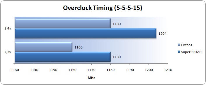Come si vede dai grafici sopra esposti questi chip hanno un ottima tolleranza all’overclock, infatti con appena 2.20v si sono raggiunti i 1160 MHz in piena stabilità, in Orthos -Blend mode-, con latenze pari a 5-5-5-15 (cas-trcp-trp-tras), mentre dando 2.40v l’incremento non è stato particolarmente considerevole, si sono raggiunti 1180 MHz in piena stabilità sempre con latenze pari a 5-5-5-15 (cas-trcp-trp-tras).