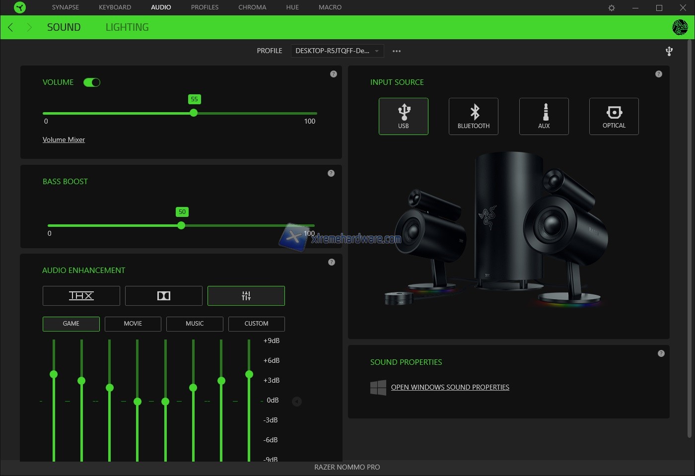 In ‘’Sound’’ potremo regolare il volume o disattivarlo/attivarlo (opzione possibile direttamente dal control pod), regolare il Boost dei bassi, scegliere se sfruttare il THX, il Dolby diviso in tre subcategorie (Game, Music, Movie) o sfruttare un equalizzatore da customizzare. A destra invece troviamo la tipologia di collegamento in essere (in questo caso USB).