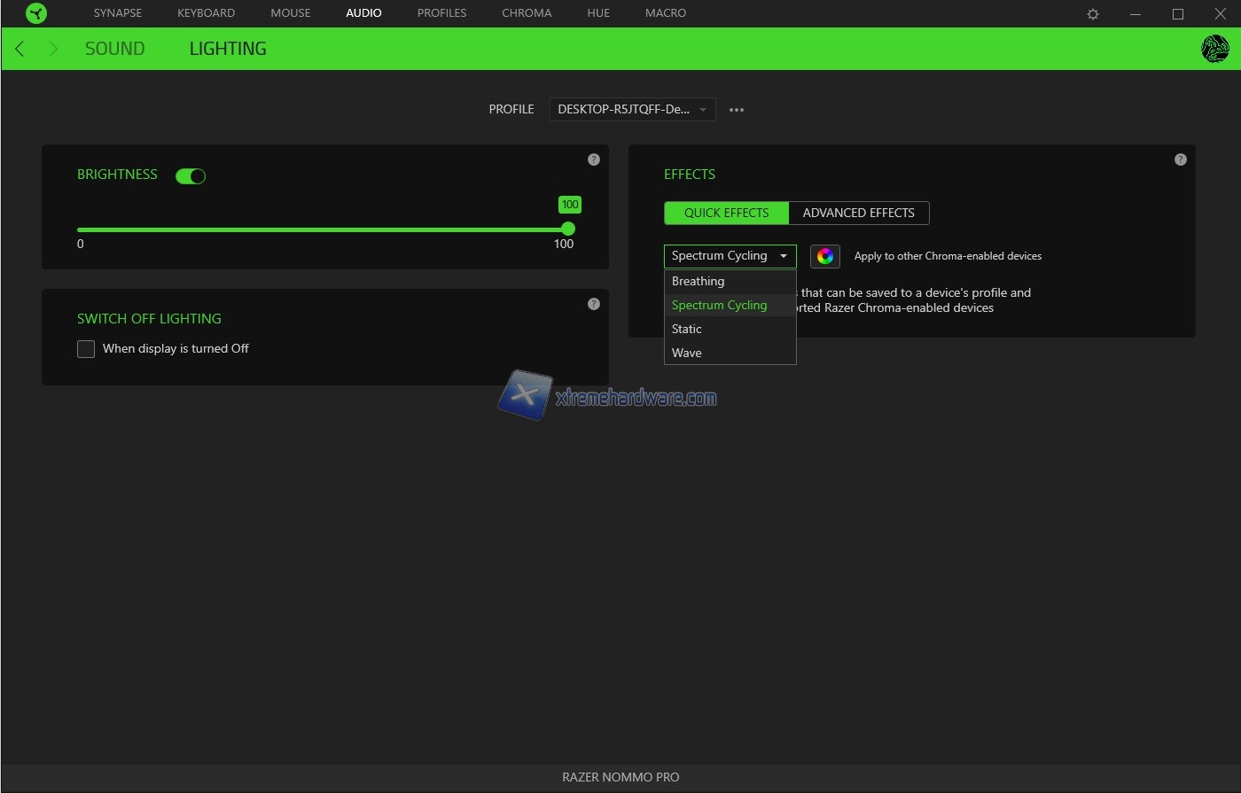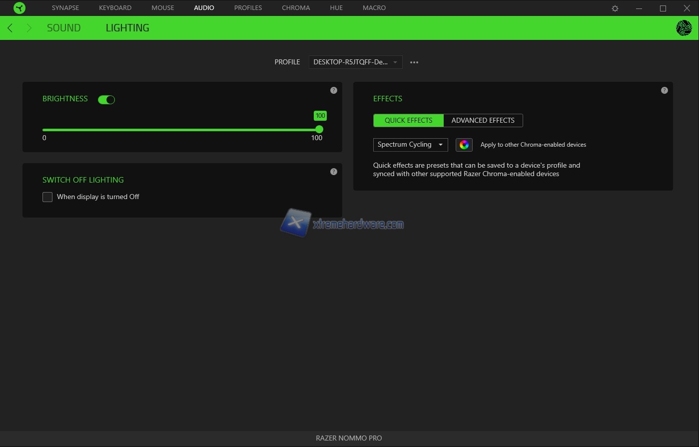 In ''Lighting’’ potremo gestire l’intensità della retroilluminazione, disattivare l’illuminazione delle casse quando il monitor sarà spento o andrà in Stand-By e infine gestire alcuni effetti di retroilluminazione oltre che personalizzazione dei colori tramite la voce Advanced del Chroma Studio.
