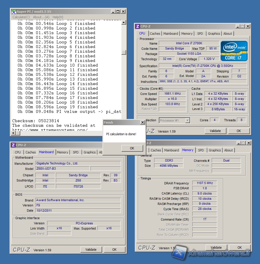 Abbiamo condotto dei test cercando di trovare la massima frequenza benchabile, ossia una frequenza tale che ci permetteva di superare il noto software di benchmark SuperPI. Come si può vedere dalle schermate seguenti abbiamo eseguito la modalità 1M prima per trovare la massima frequenza operativa della cpu e poi infine cercando di stabilire se vi sono stati miglioramenti sulla massima frequenza di bclk e ram rispetto alla cpu i7-2600K. Il sistema usato per il raffreddamento della cpu è di tipo water cooling: